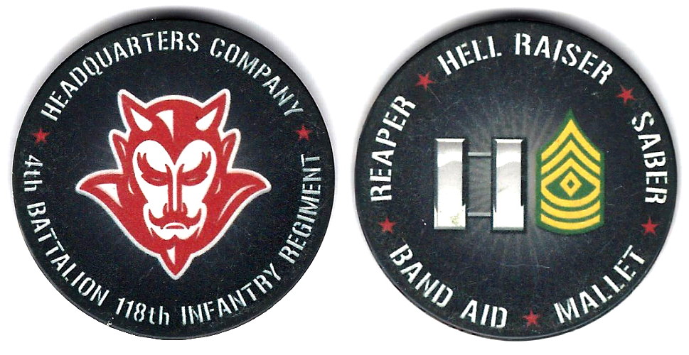 Round shaped poker chip, black in color, 1 3/4 inches in diameter. Headquarters Company, 4th Battalion, 118th Infantry Regiment, South Carolina Army National Guard. The 118th Infantry Regiment is an infantry regiment of the United States Army,... Read More