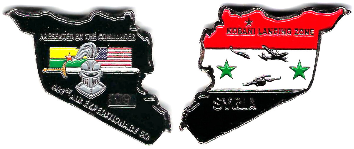Syria map shaped coin, pewter in color, 1 3/4 inches high x 2 1/4 inches wide. 441st Air Expeditionary Squadron, Kobani, Syria Read More
