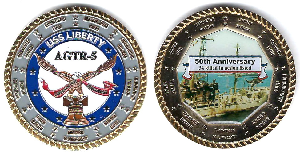 Round shaped coin, brass in color, 2 inches in diameter. USS Liberty AGTR-5 Read More