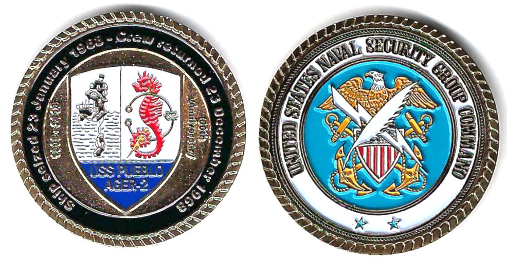 Round shaped coin, brass in color, 1 3/4 inches in diameter. USS Pueblo AGER-2 Read More