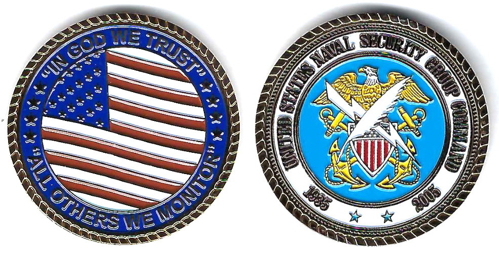 Round shaped coin, brass in color, 1 3/4 inches in diameter. U.S. Naval Security Group Command. Read More