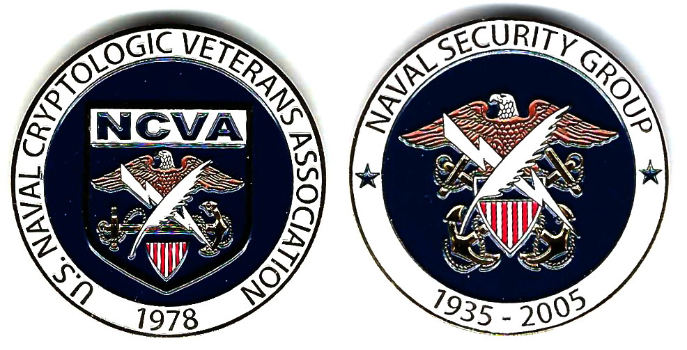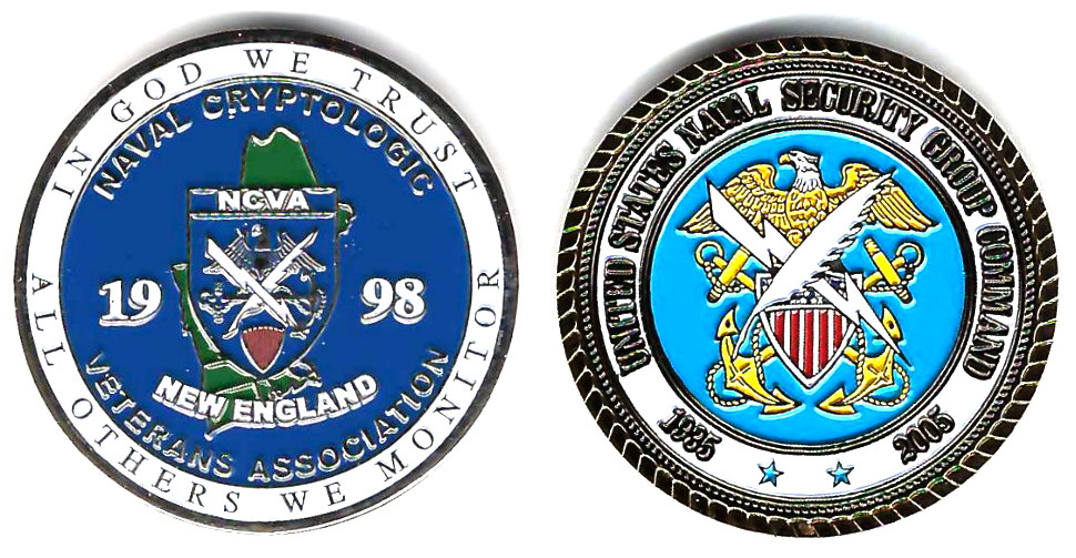 Round shaped coin, pewter in color, 1 3/4 inches in diameter. New England Chapter, U.S. Naval Cryptologic Veterans Association Read More
