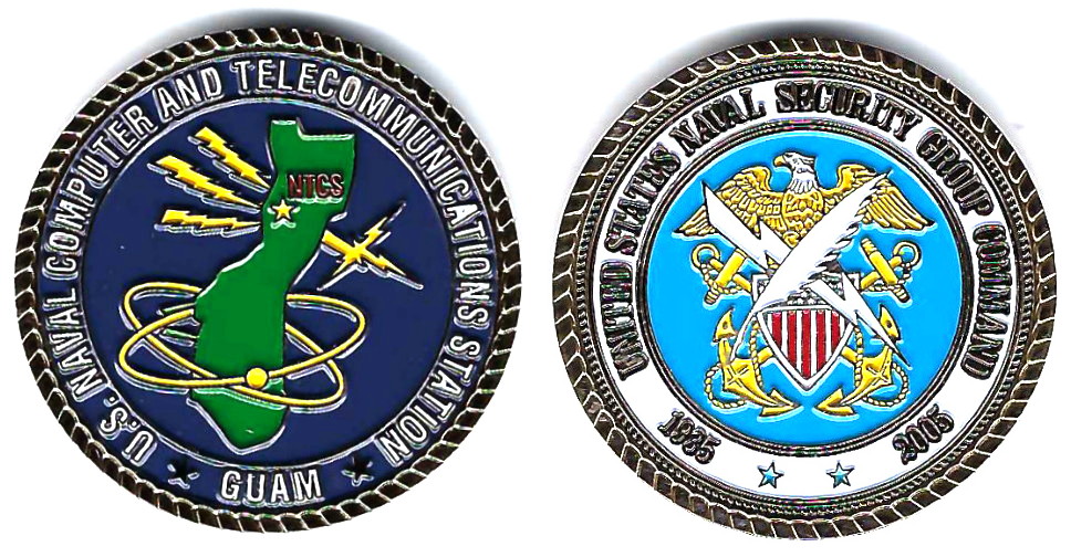 Round shaped coin, brass in color, 1 3/4 inches in diameter. U.S. Naval Computer & Telecommunication Station, Guam. Read More