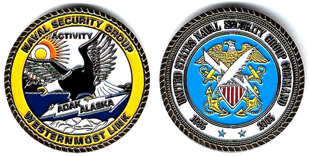 Round shaped coin, brass in color, 1 3/4 inches in diameter. U.S. Naval Security Group Activity, Adak, Alaska. Read More
