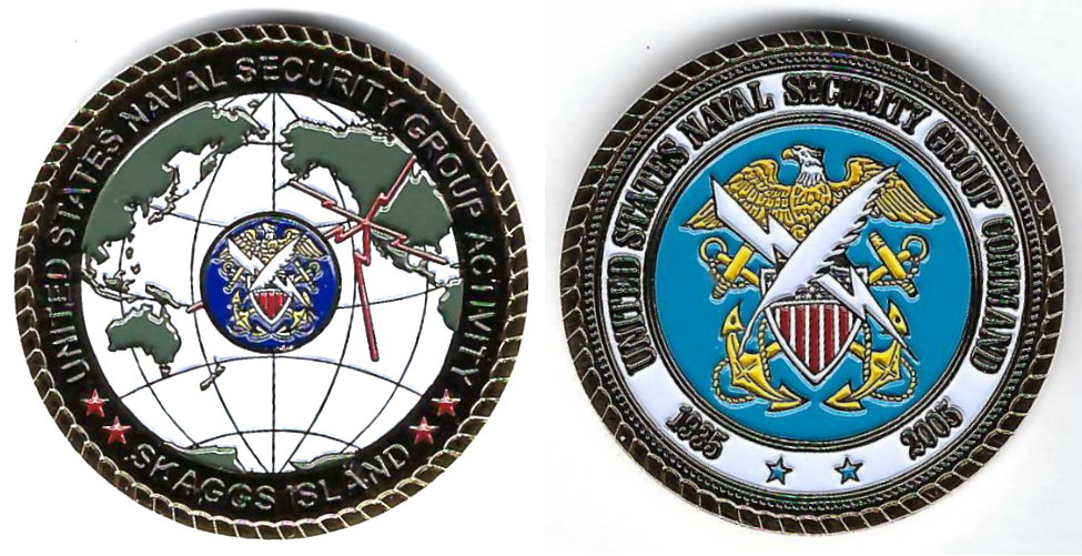 Round shaped coin, brass in color, 1 3/4 inches in diameter. U.S. Naval Security Group Activity, Skaggs Island, California. Read More