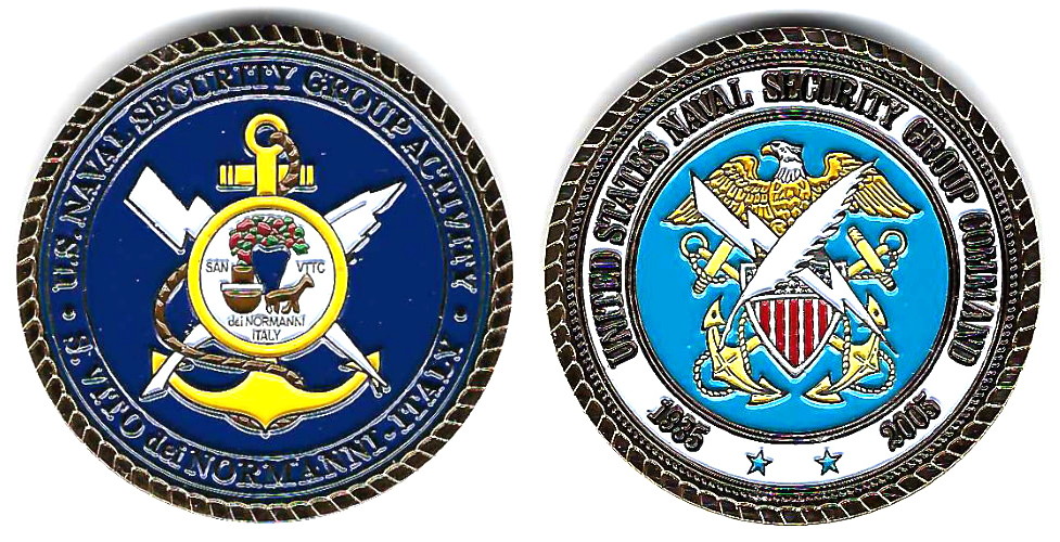 Round shaped coin, brass in color, 1 3/4 inches in diameter. U.S. Naval Security Group Activity, San Vito dei Normanni, Italy. Read More