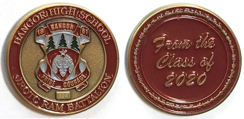 Round shaped coin, 1.75 inches in diameter, brass in color. Coin is numbered 024. The City of Bangor, Maine has the distinction of being the first city in the United States to adopt military training in its public school system. Bangor High School's... Read More