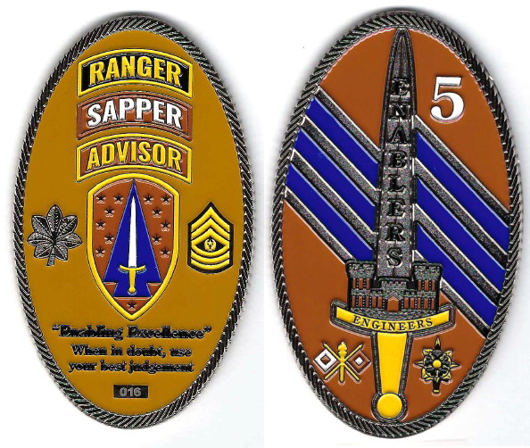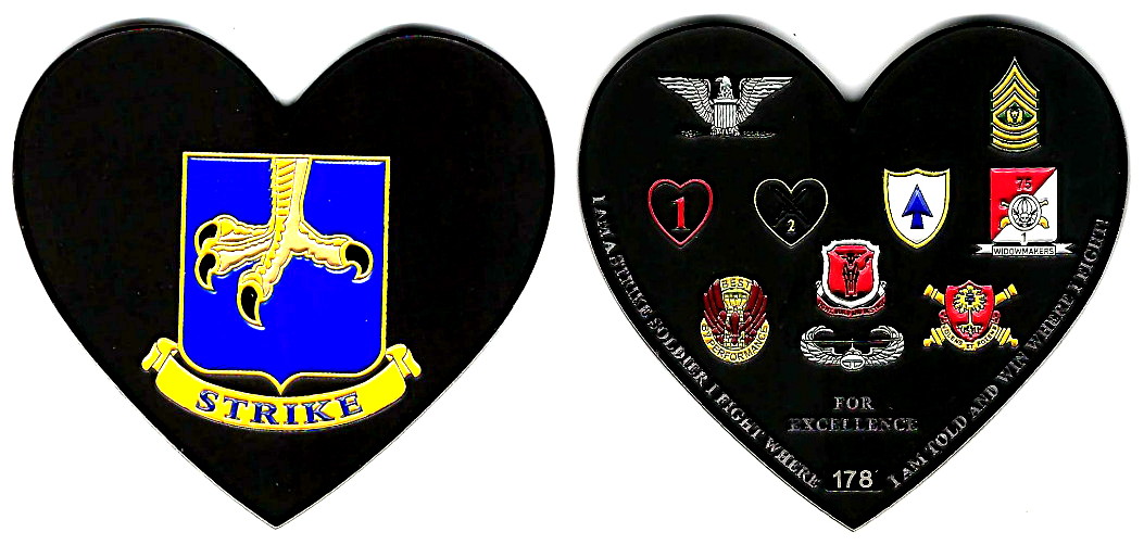 SIDE ONE: A royal blue shield featuring an eagle leg, a yellow banner underneath with a dark blue motto, "STRIKE"; all on a black background. SIDE TWO: Colonel insiginia on the upper left, Command Sergeant Major insignia on the upper right, 8 uniden... Read More