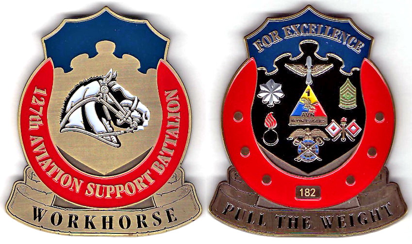 SIDE ONE; Red horseshoe labeled, "127th Aviation Support Battalion" in gold letters; surrounding a blue and gold shield featuring a black and white horse's head with halter; surmounting a gold ribbon banner labeled, "WORKHORSE" in black letters. SID... Read More