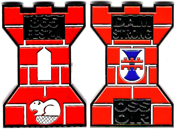 A red crenelated stone tower with white detail and pewter edges. SIDE ONE: The unit name in pewter lettering on a black rectangular sign at the top; a white doorway at mid-tower; and a white beaver at the tower base. SIDE TWO: A motto, "DAM STRONG,... Read More