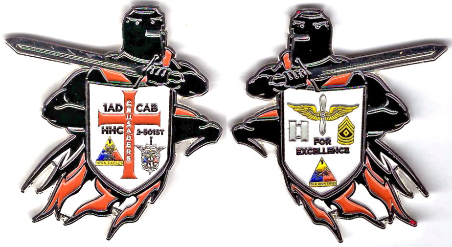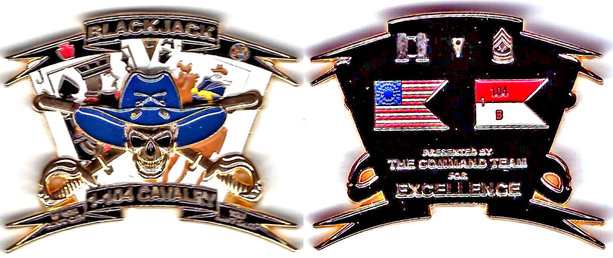 SIDE ONE: On a background of a poker hand, the skull and crossed sabers of a Cavalry insignia, with a ribbon banner above labelled, "BLACKJACK", and one below labelled, "1-104 CAVALRY". SIDE TWO; From top to bottom, Captain and First Sergeant insi... Read More
