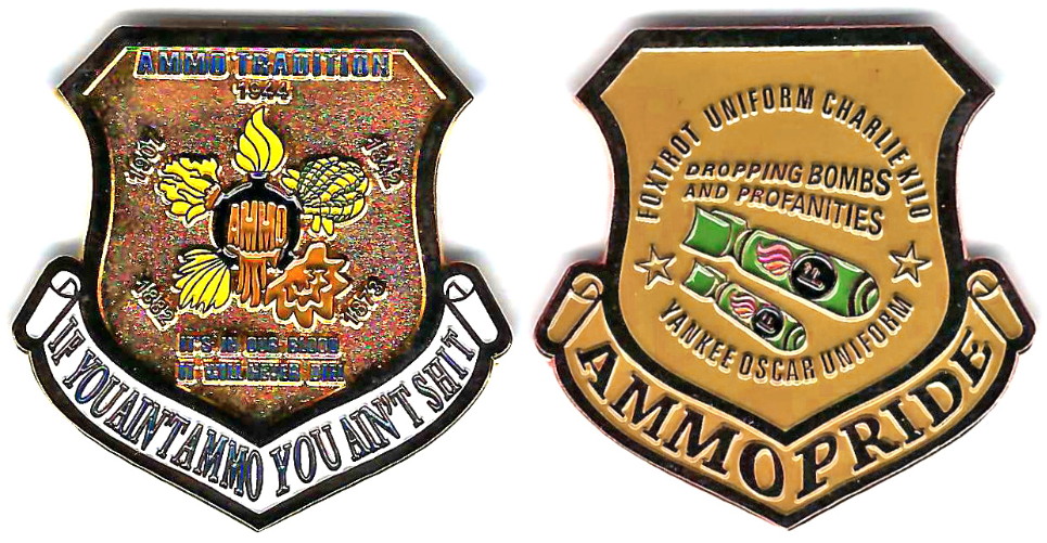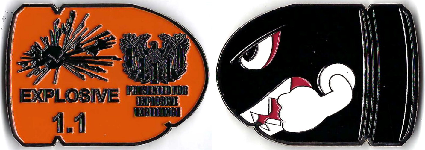 SIDE ONE: Bullet projectile shaped coin 1 3/4 inches high x 2 1/2 inches wide; at the projectile base from top to bottom, an explosion depiction, the word, "EXPLOSIVE" and the number, "1.1"; at the tip, the warrant officer insignia on which the warra... Read More