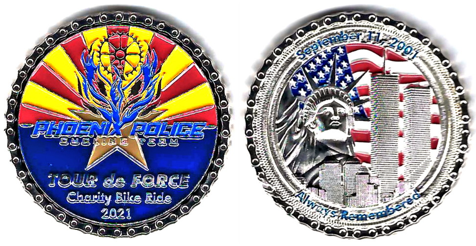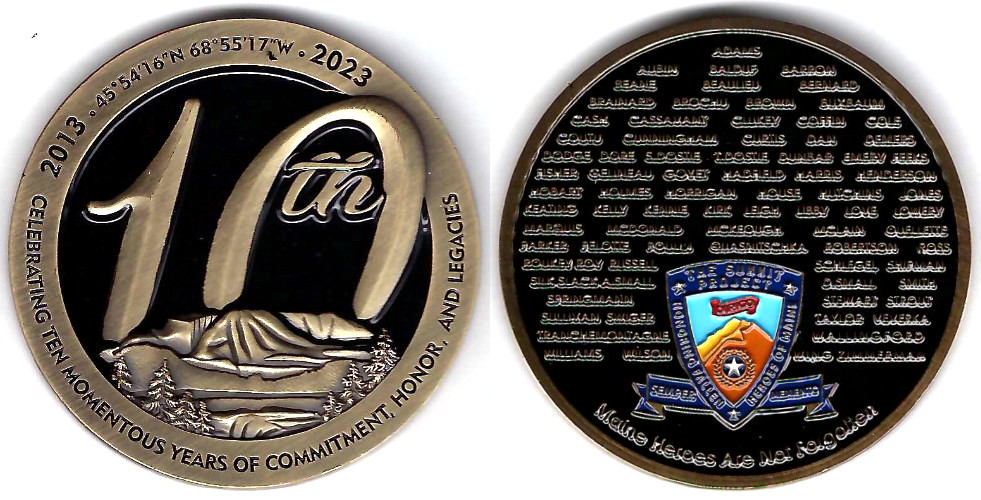 SIDE ONE: On a brass background, a brass number, 10 over a brass landscape surrounded by a brass border. SIDE TWO: On a black background, the names off fallen soldiers from Maine who have died in the line of duty since September 11, 2001, surround... Read More