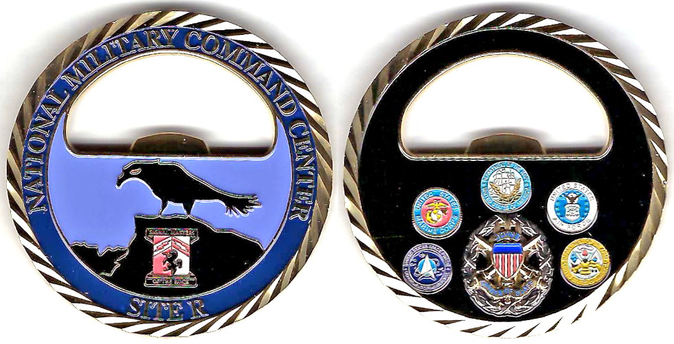 SIDE ONE: Round shaped bottle opener featuring a black raven perched on top of a black mountain against a night sky. Within the mountain, a 114th Signal Battalion insignia, labelled, "signal Masters of the Rock". SIDE TWO: Insignia of U.S. Space... Read More