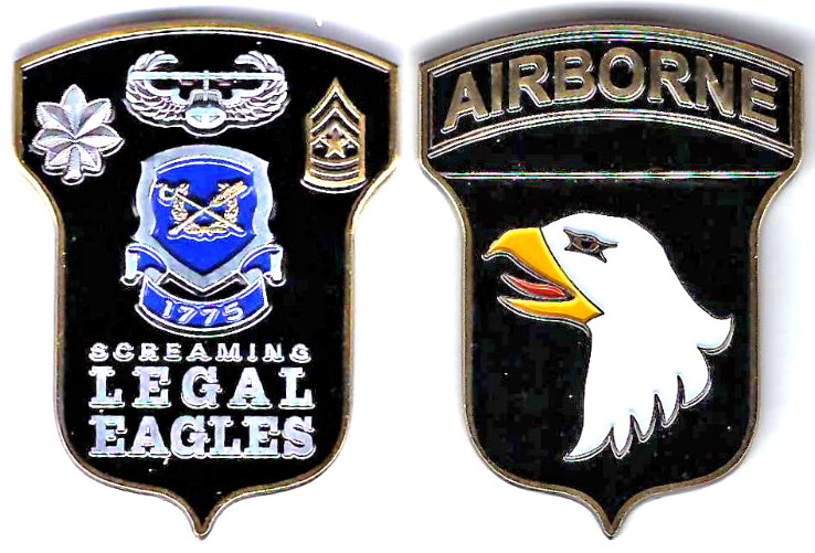 SIDE ONE: On a black background surrounded by a narrow brass border, from left to right at the top, a lieutenant Colonel insignia of rank, an Army air assault insignia, and a Sergent Major insignia of rank; at center, a staff judge advocate insignia;... Read More
