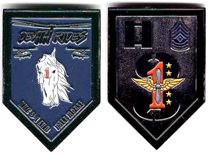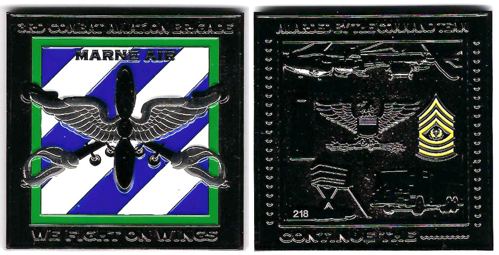 SIDE 1: On the blue, white and green background of the 3rd Infantry Division patch, a black and pewter Army aviation insignia backed by a pair of pewter and black crossed sabers labelled "Marne Air"; surrounded by a wide black border inscribed, "3rd... Read More