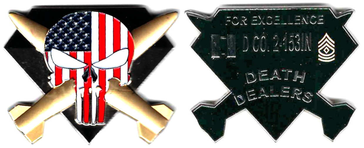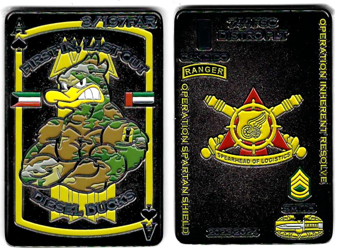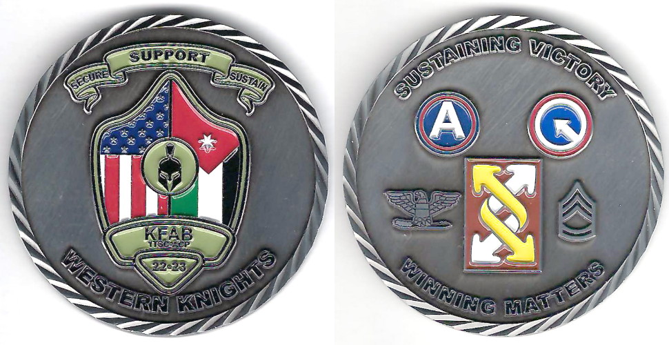 SIDE 1: SIDE 2: On a pewter background, the 143rd Expditionary sustainment Command insignia flanked by LTC and CSM insignias of rank and labelled, "Sustaining Victory" above and "Winning Matters" below". all surrounded by a pewter border. The... Read More