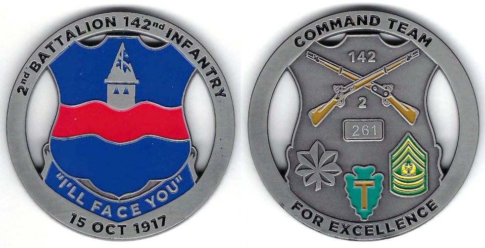 SIDE 1: "Taken from the shield portion of the unit’s coat of arms, the 142nd Distinctive Unit Insignia celebrates the Regiment’s contributions to the 36th Division’s World War I success. The shield’s blue background is for Infantry, and the wavy band... Read More