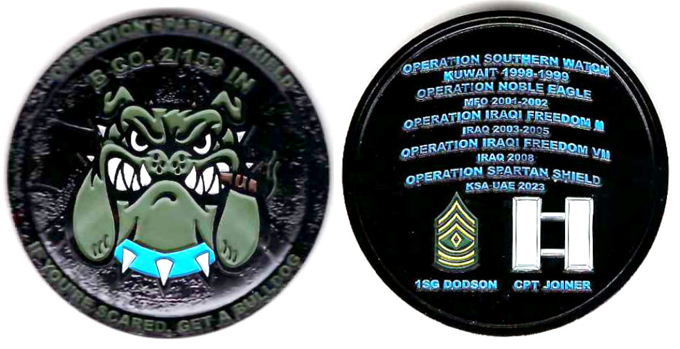 SIDE 1: On a maroon background, from top to bottom, the activity name, "Operation Spartan Shield"; G6 symbol (communications) escorted left and right by MAJ Pasquier and SGM Eippeire insignia of rank; motto "Pro Patria Vigilians" (Watchful for the Co... Read More
