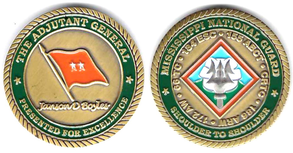 SIDE 1: Seal of the Mississippi National Guard: Centered on a blue stylized vertical oval with light blue background and red borders, a Minuteman within a shield covering the breast of an Eagle holding an olive branch and three arrows. Below the shie... Read More