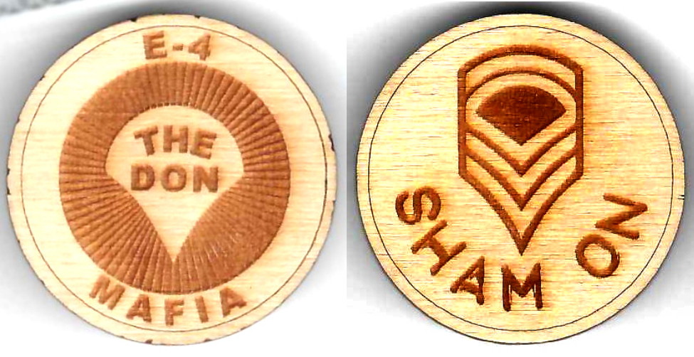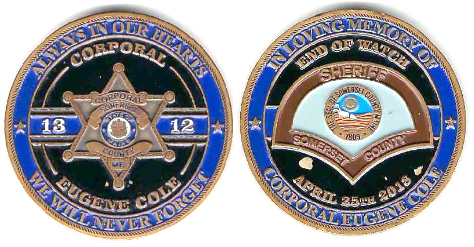 SIDE 1: On a black background, a Somerset County, Maine, law enforcement badge backed by a blue band inscribed with Corporal Coles badge number (1312); above the badge, the rank, "Corporal" and below, the name "Eugene Cole"; surrounded by a blue bord... Read More