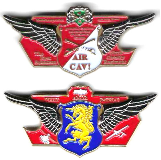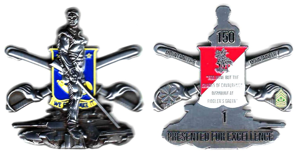 SIDE 1: A historical mountaineer armed with a flintlock musket standing in front of the 150th Cavalry coat of arms and a pair of crossed sabers; at the mountaineer's feet, an Abrams Tank. SIDE 2: On a shield divided diagonally, red over white, a m... Read More
